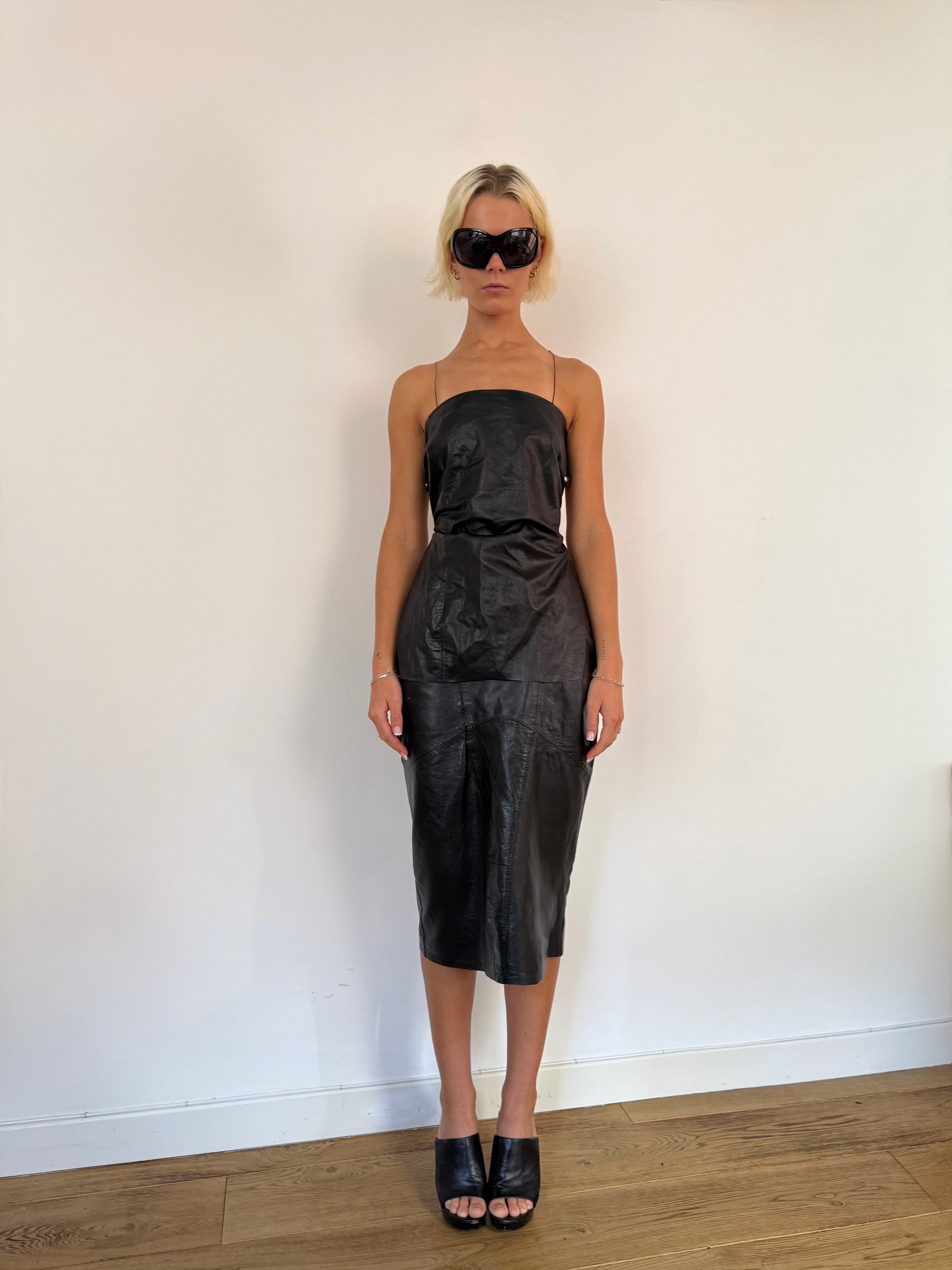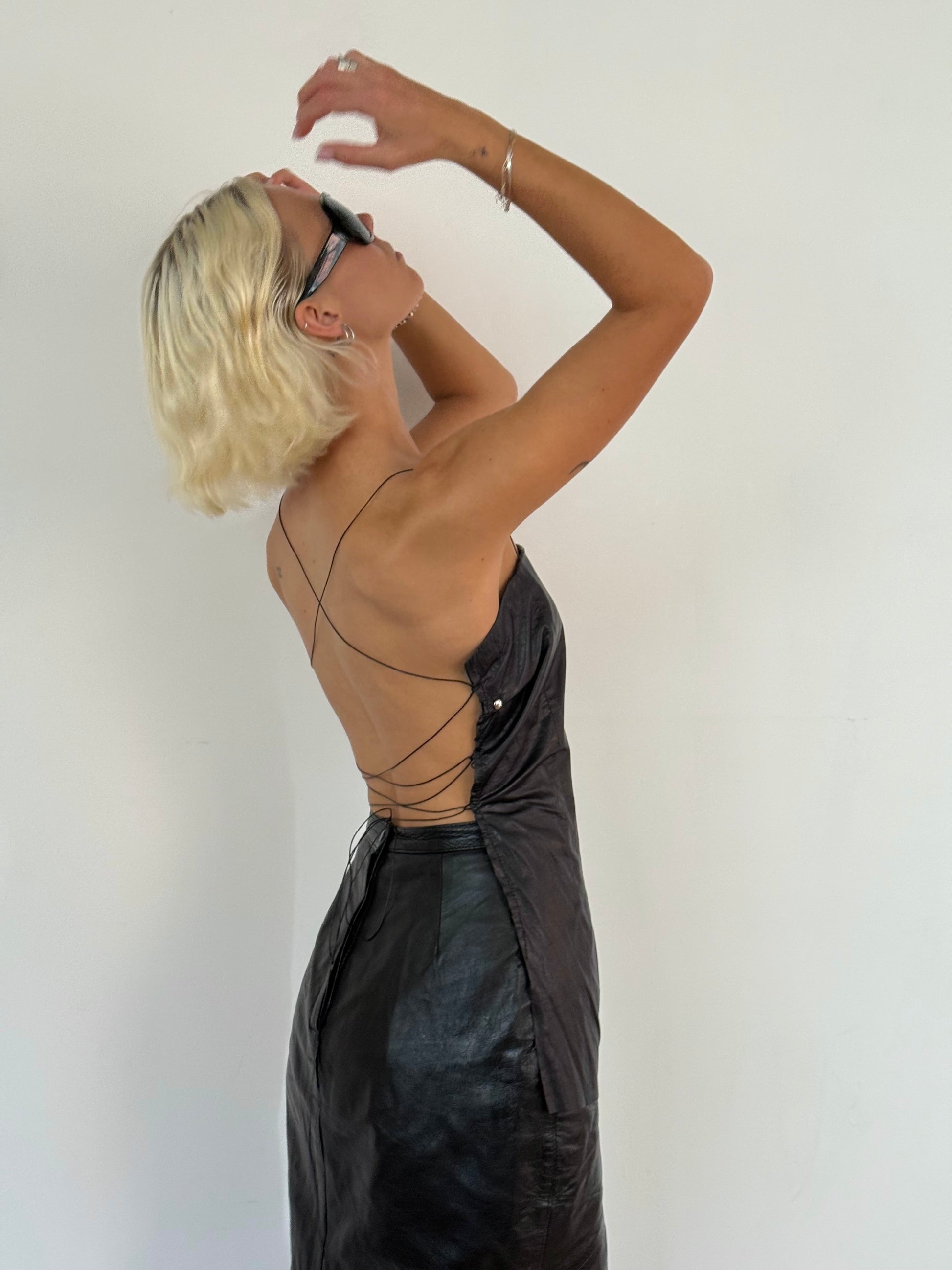 Created using vintage leather. Thin lace up leather strapped with stud detailing.