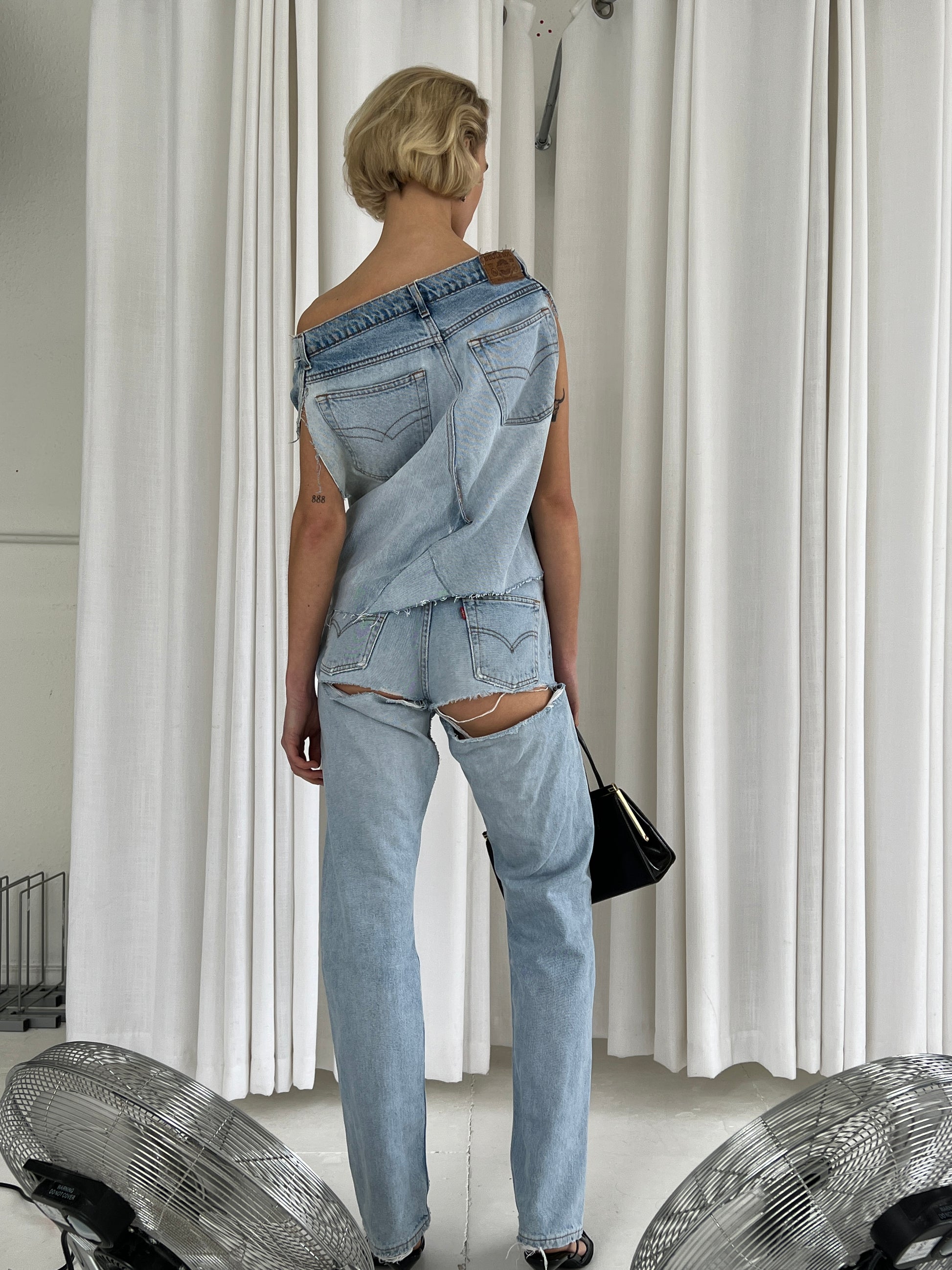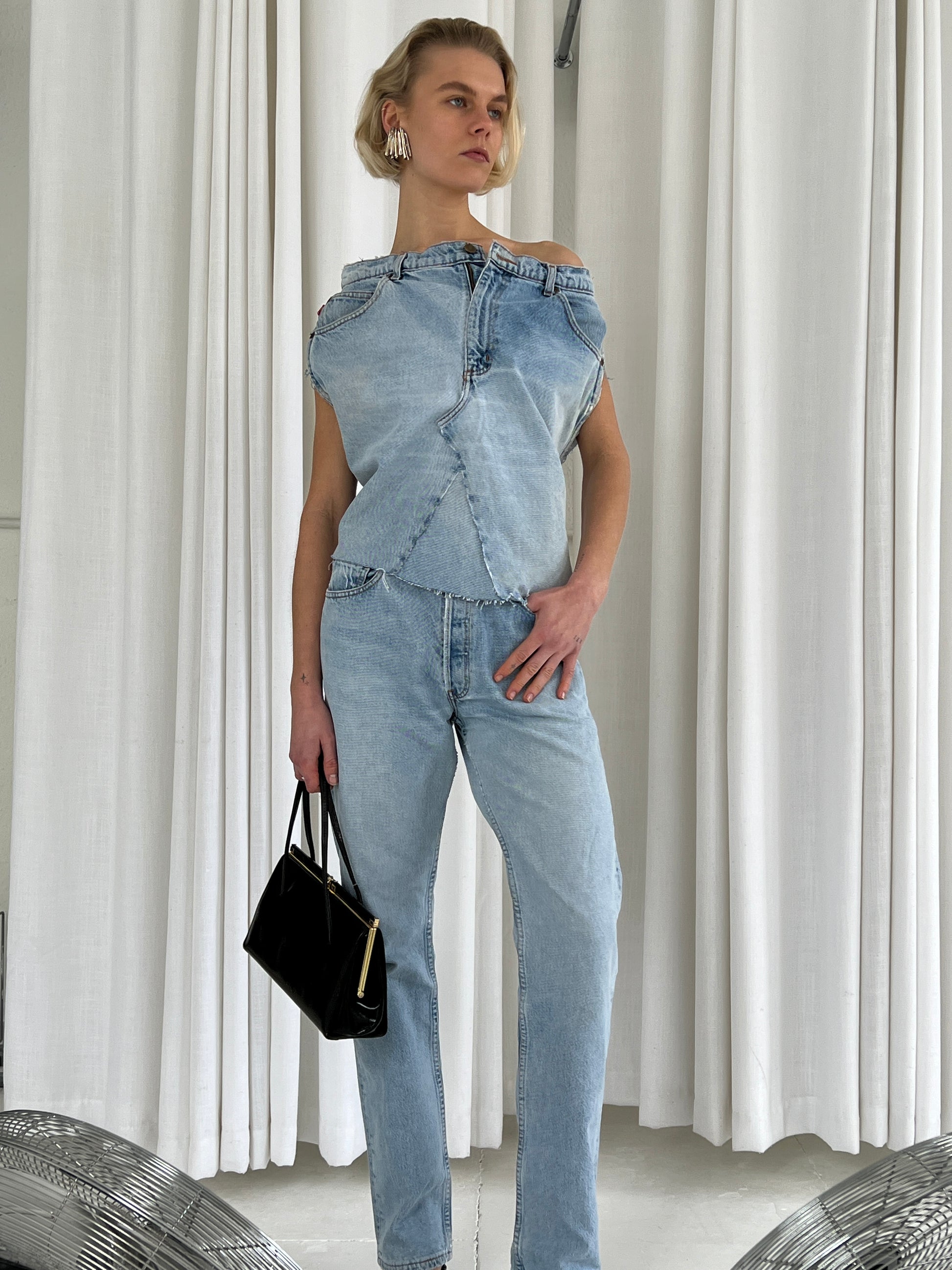 This off the shoulder denim top is crafted from upcycled denim jeans, giving it a unique and eco-friendly twist. The pale denim color adds a touch of effortless style to any outfit. Made for the fashion-forward and environmentally conscious customer.