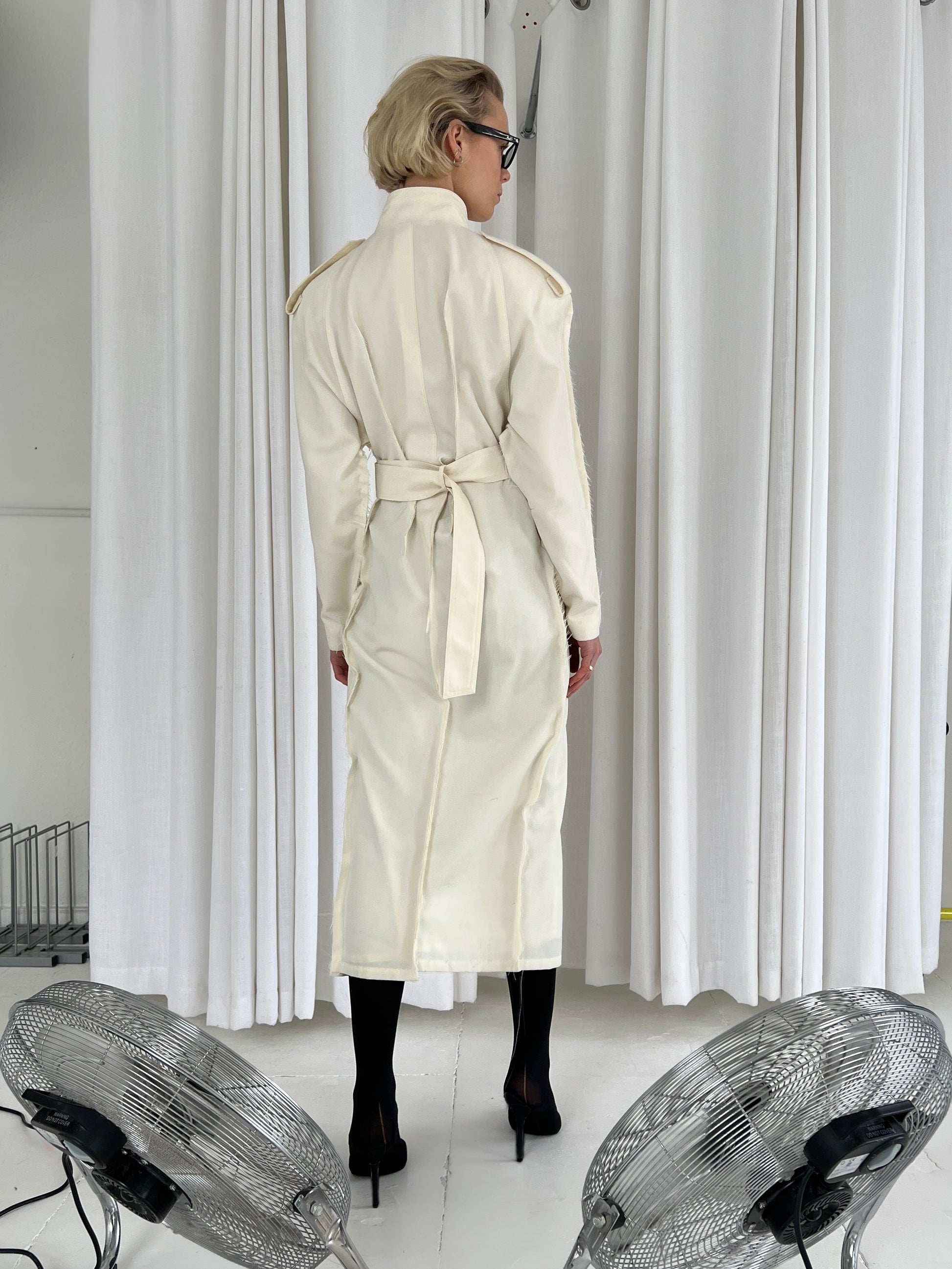 This vintage cream trench coat from the 90s features open seam detailing and contouring for a unique and elegant look. Designed with versatility in mind, this coat is perfect for any occasion and will elevate your outfit with its timeless appeal. Add this staple piece to your wardrobe for a touch of sophistication.