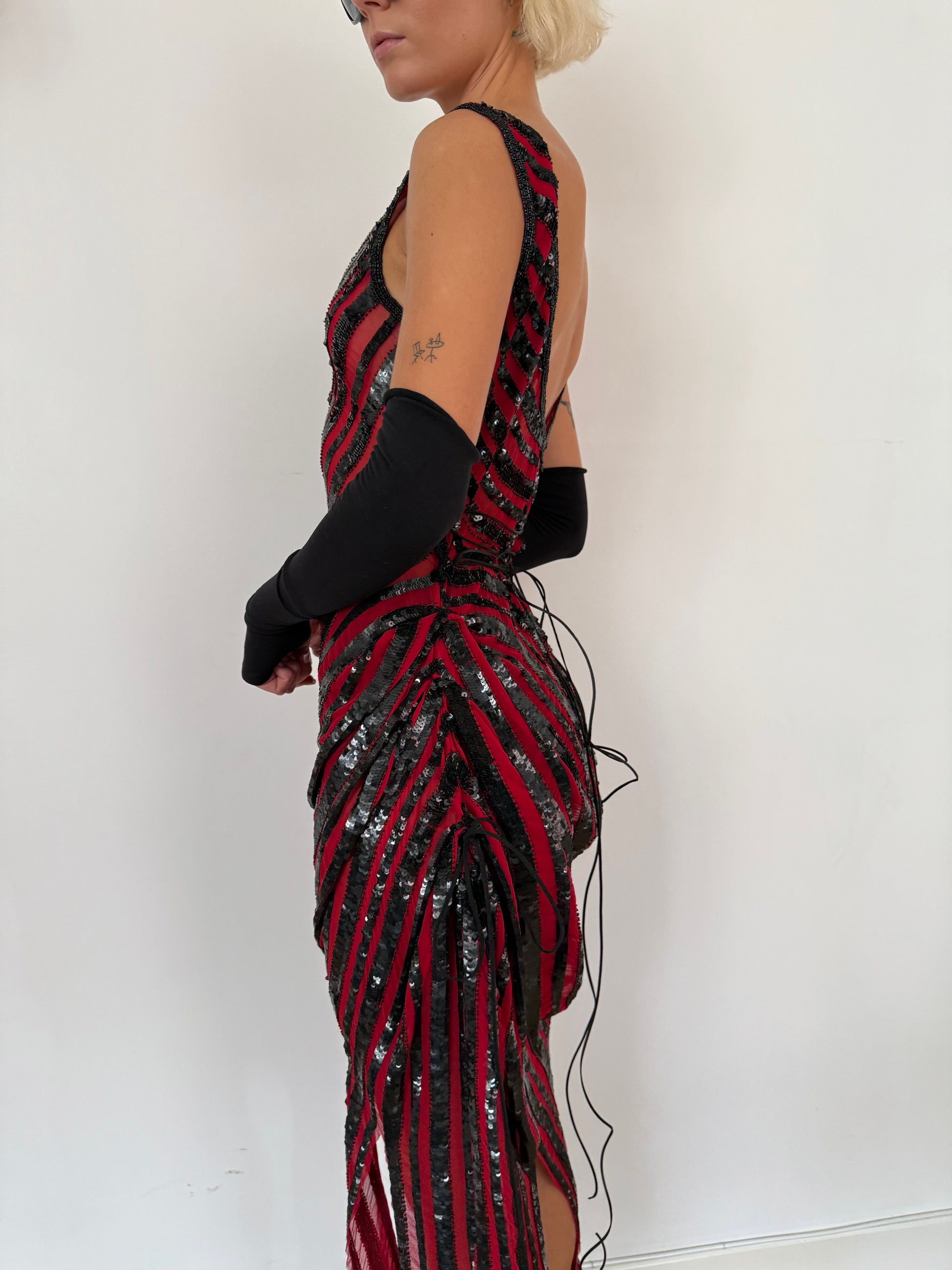 Red & Black Distressed Sequin Dress